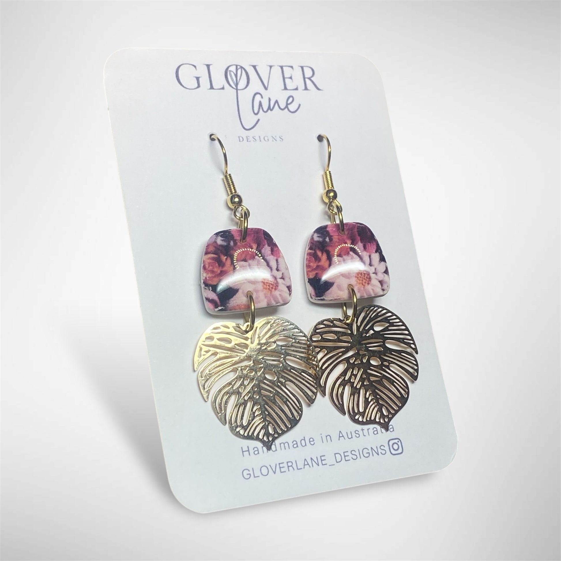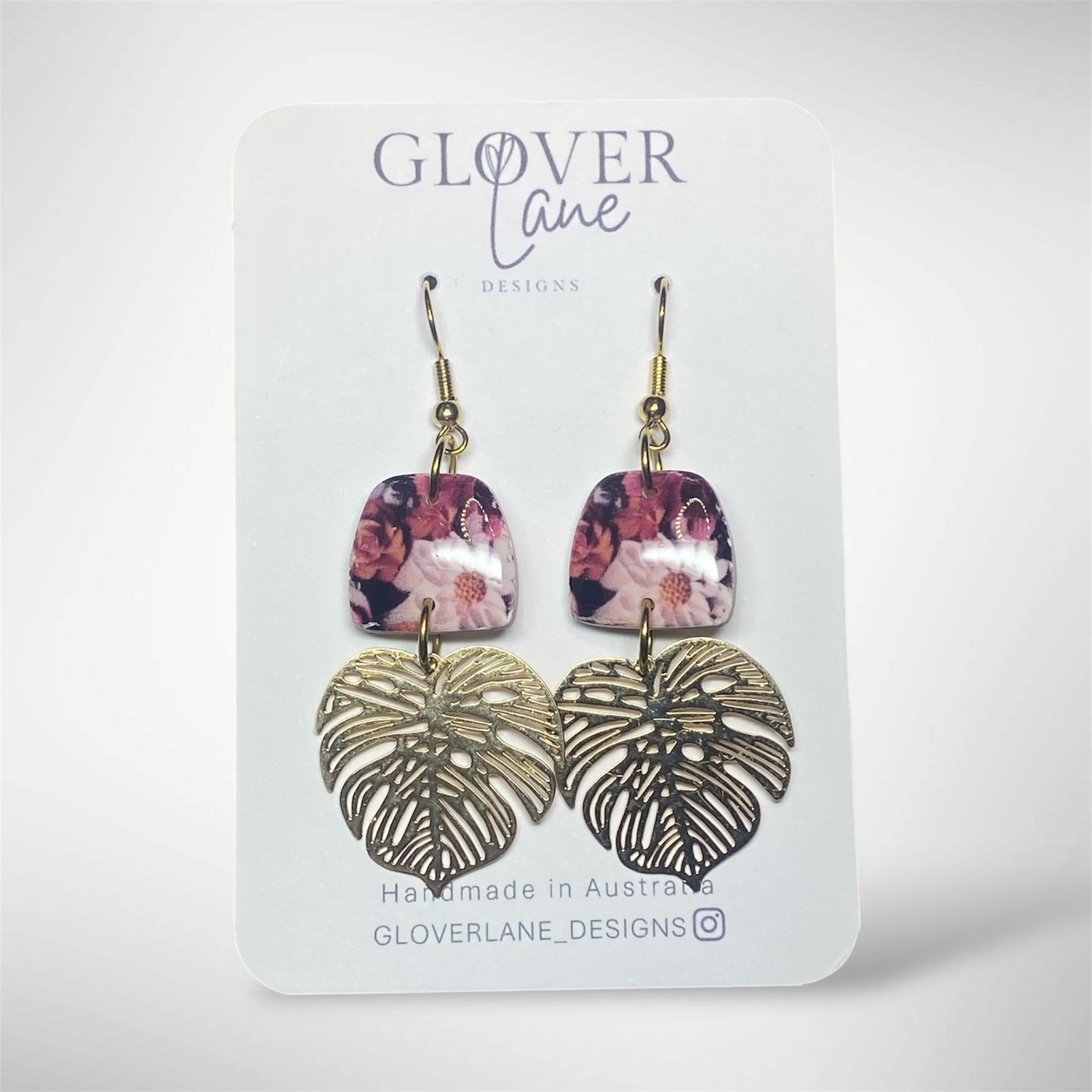 Gorgeous unique handcrafted floral print polymer clay dangles coated with resin. A gold coloured brass monstera leaf dangle adds that extra elegance and charm.