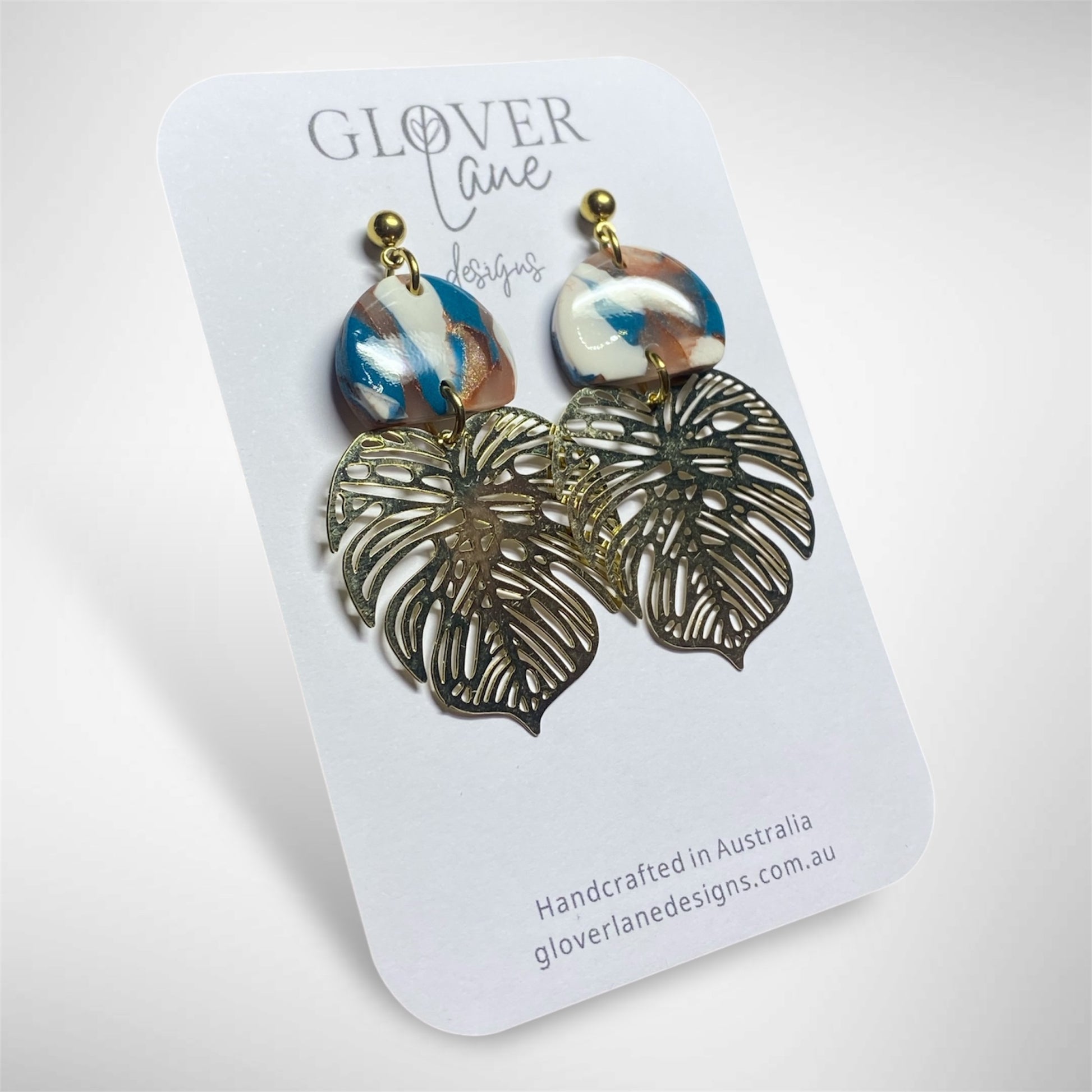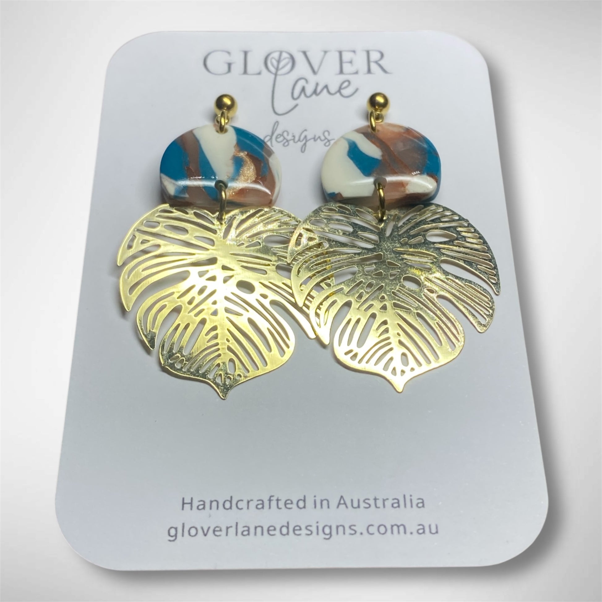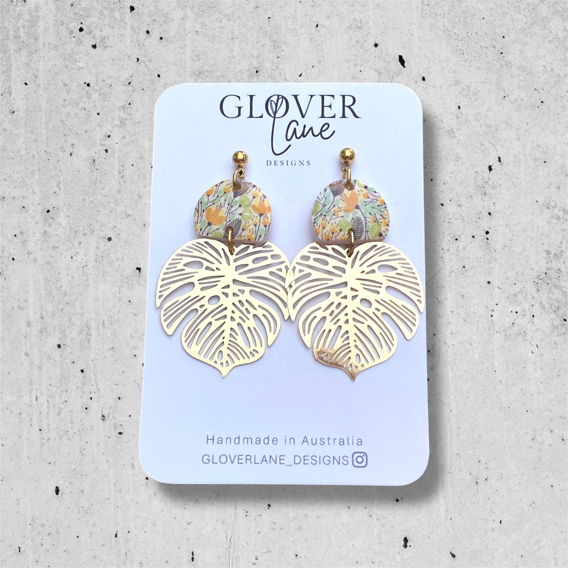 Gorgeous print polymer clay dangles with gold coloured brass monstera leaf.