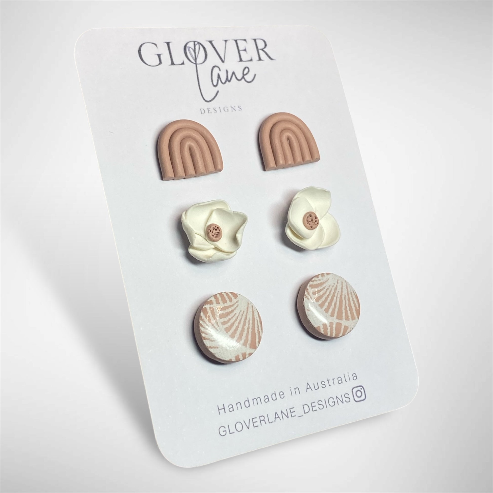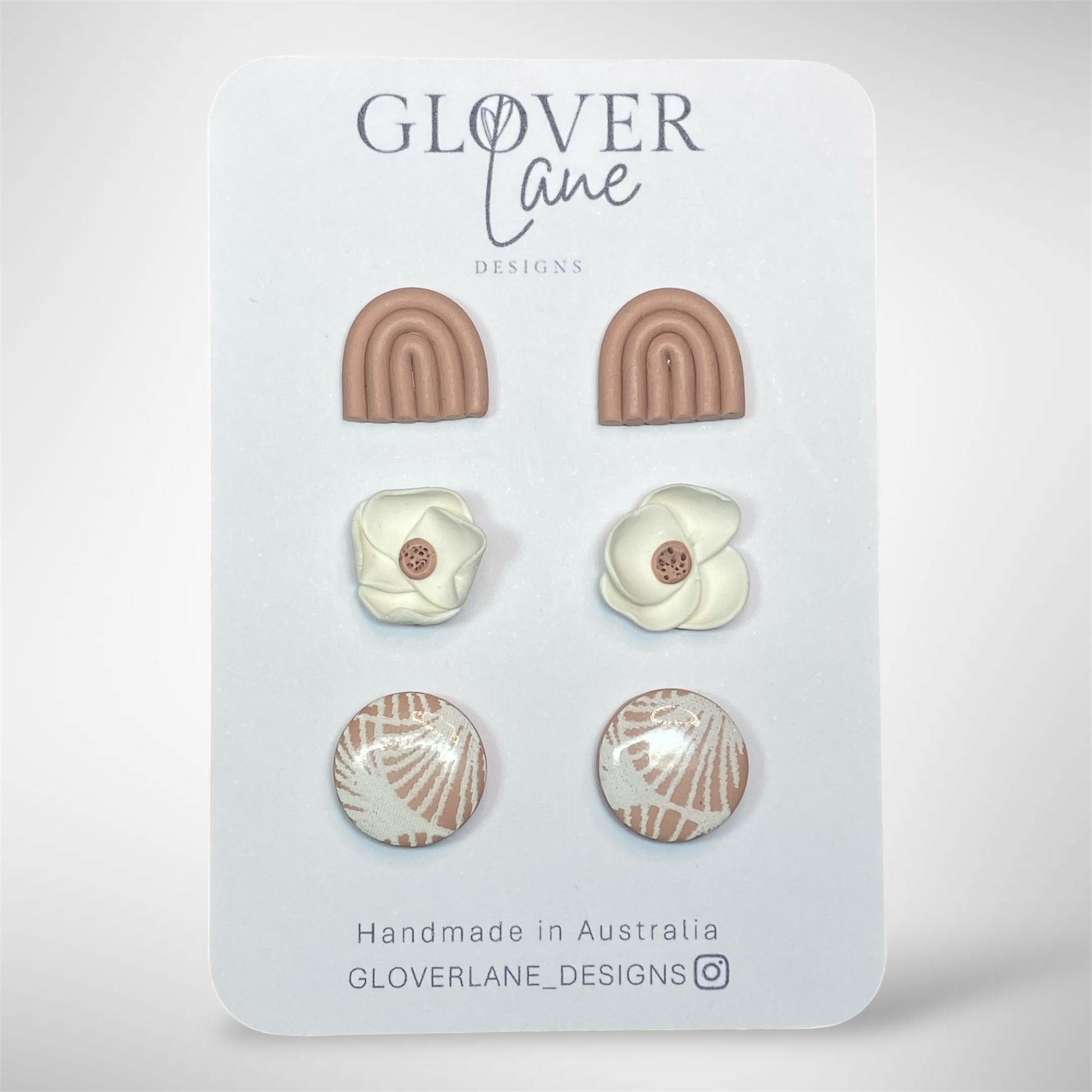 This beautiful floral stud pack features a trio of handcrafted polymer clay earrings in a sophisticated delicate pink palette.