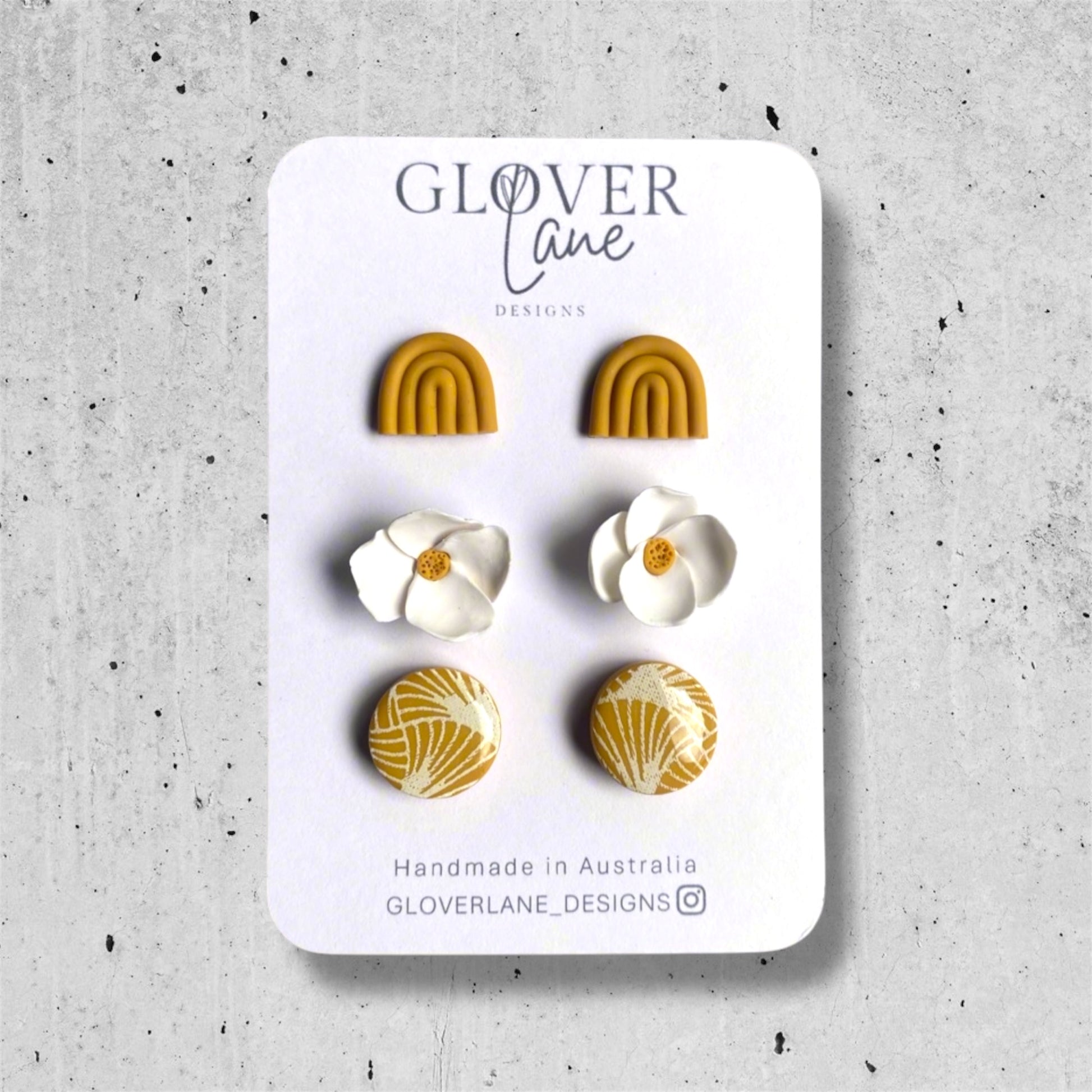 This beautiful floral stud pack features a trio of handcrafted polymer clay earrings in a sophisticated mustard palette.