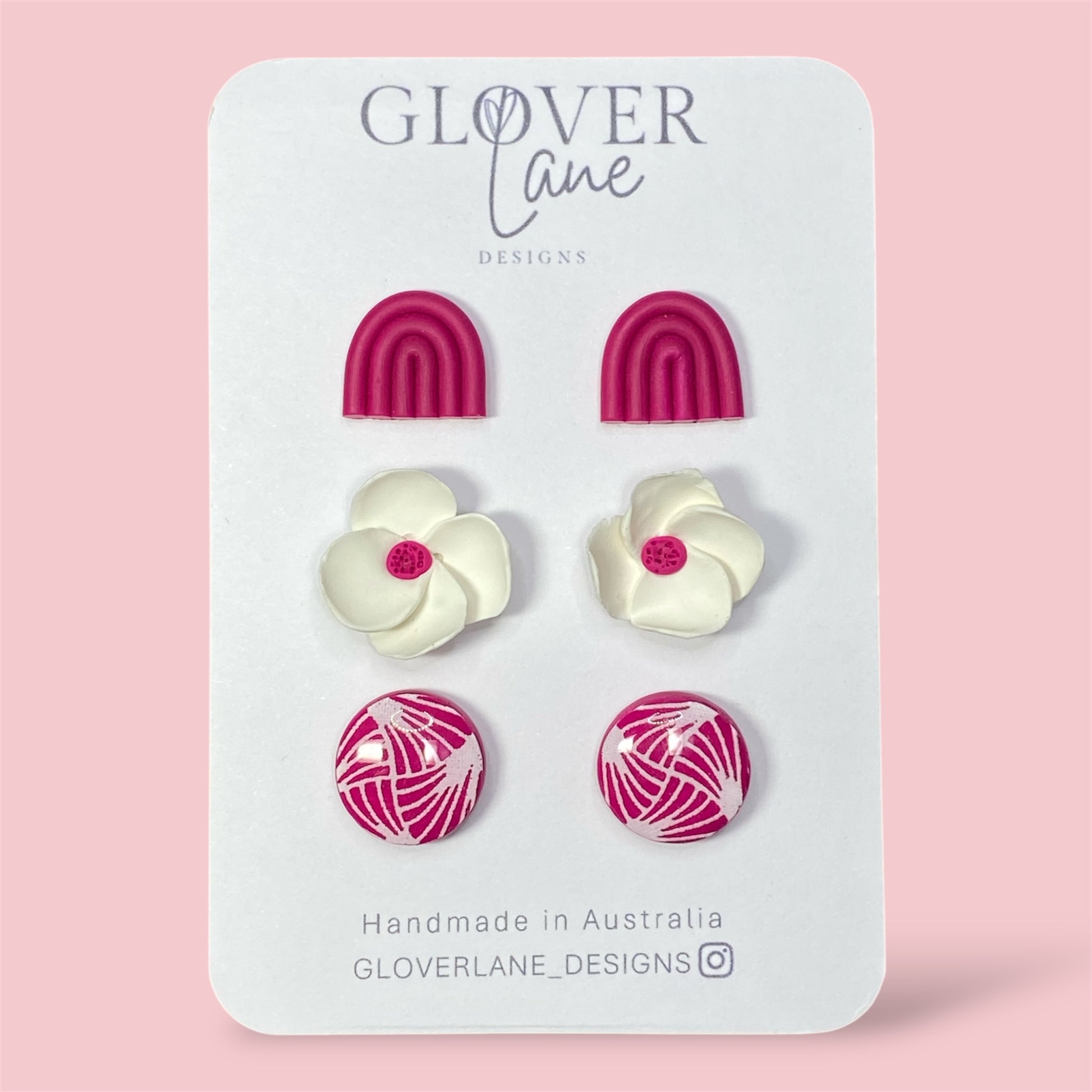 This beautiful floral stud pack features a trio of handcrafted polymer clay earrings in a sophisticated fuchsia palette.