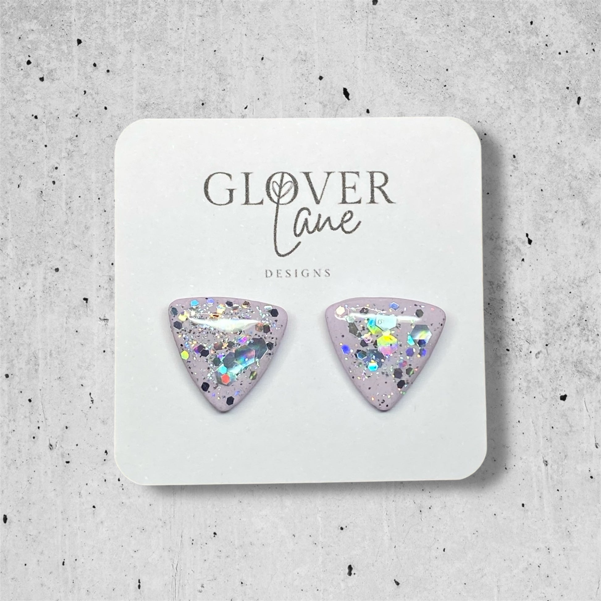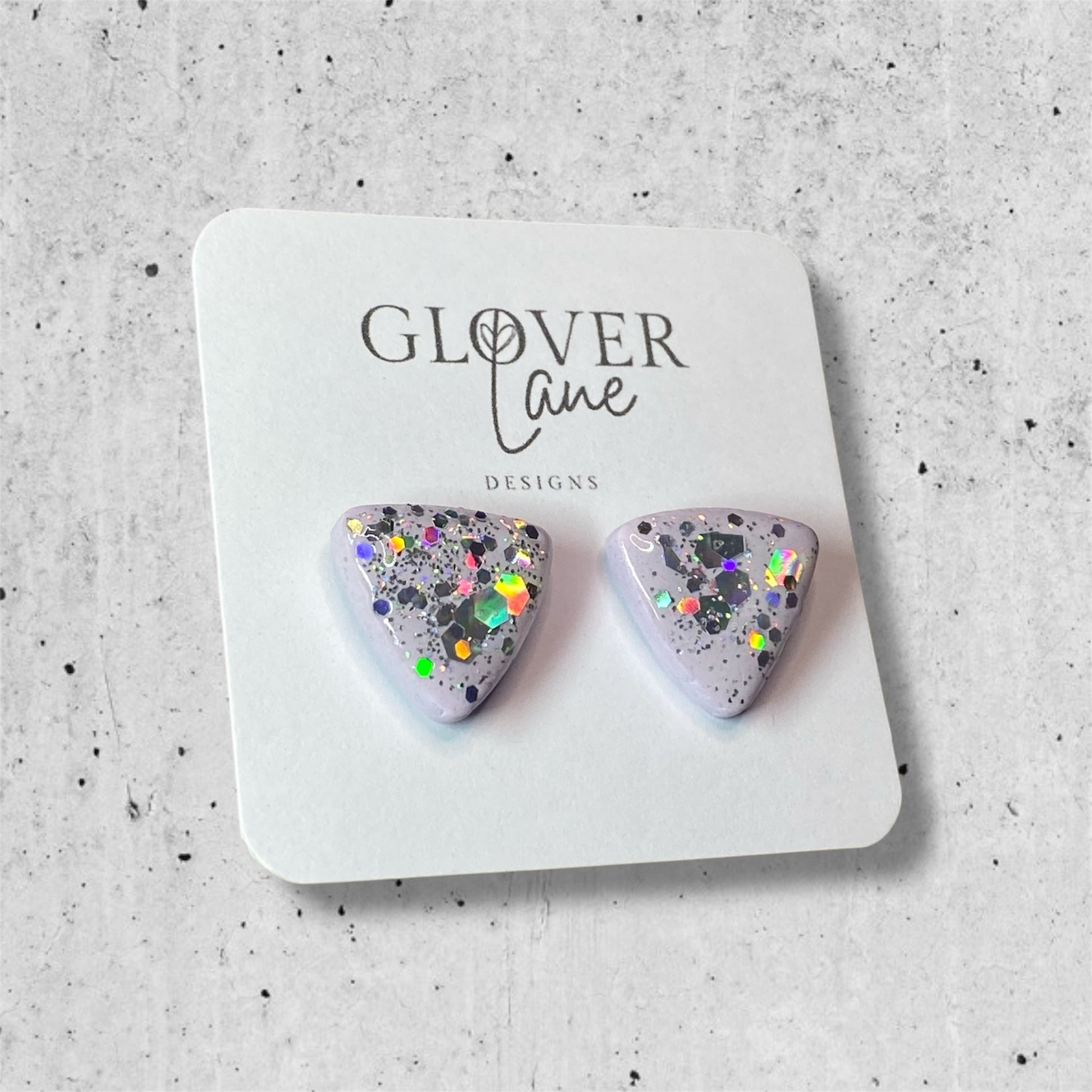 Handcrafted holographic glitter studs are sure to turn heads. They change colour as you move. The polymer clay is hand blended and a one-off colour, topped with resin for a lustrous shiny finish.