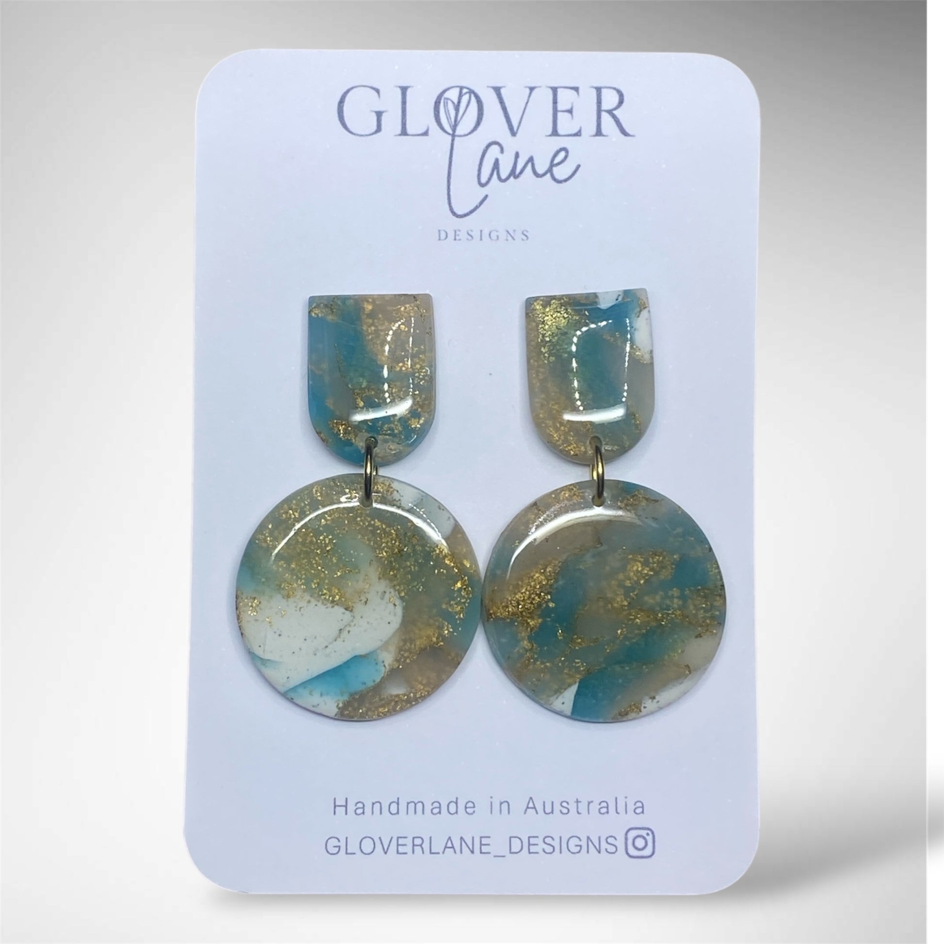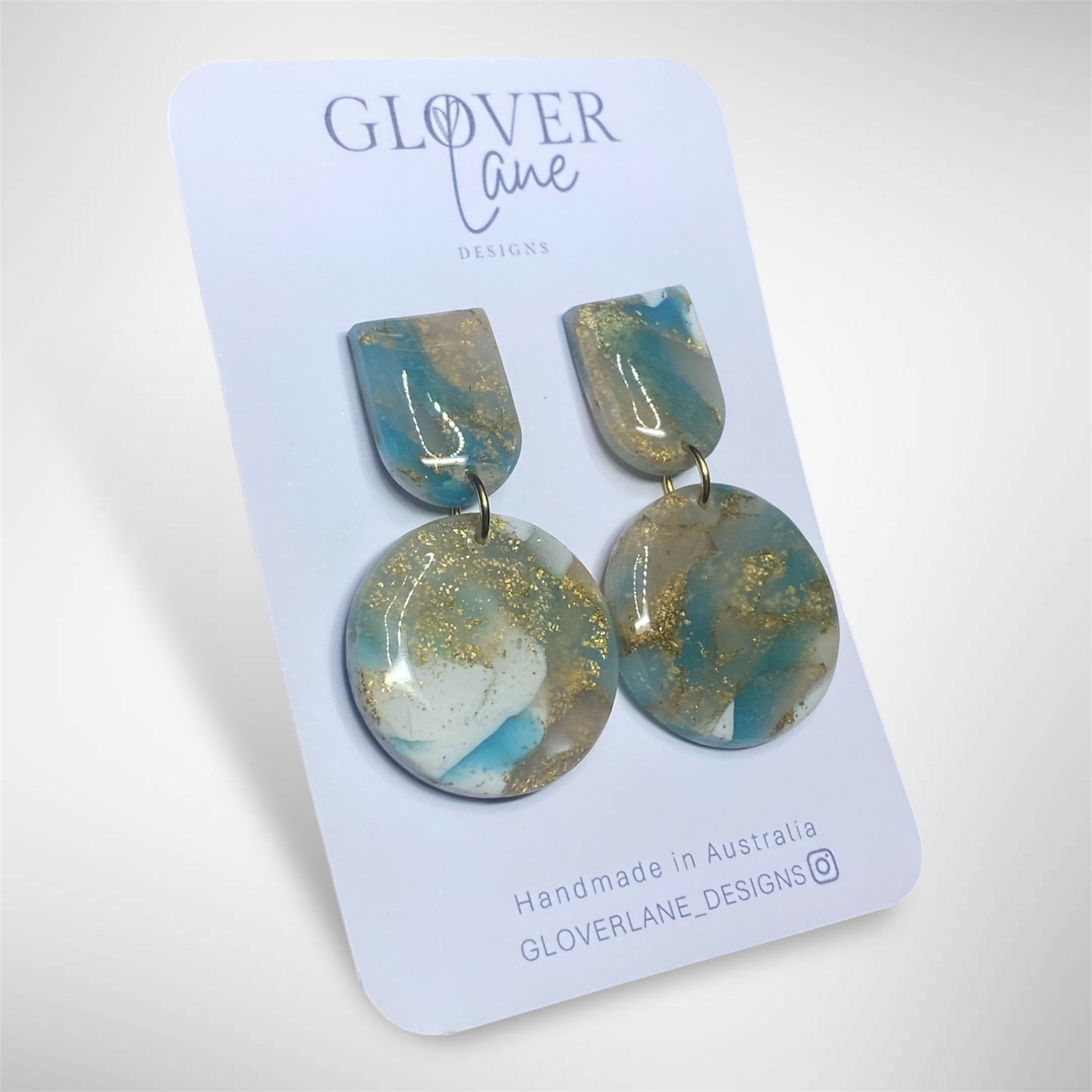 Inspired by the meeting of ocean waves and golden shores, the Seabreeze Glow Earrings capture the beauty of nature in every detail. Handcrafted from polymer clay and resin, these earrings feature a mesmerising blend of deep blue, soft white, and shimmering gold, reminiscent of sunlit tides washing over sandy beaches.
