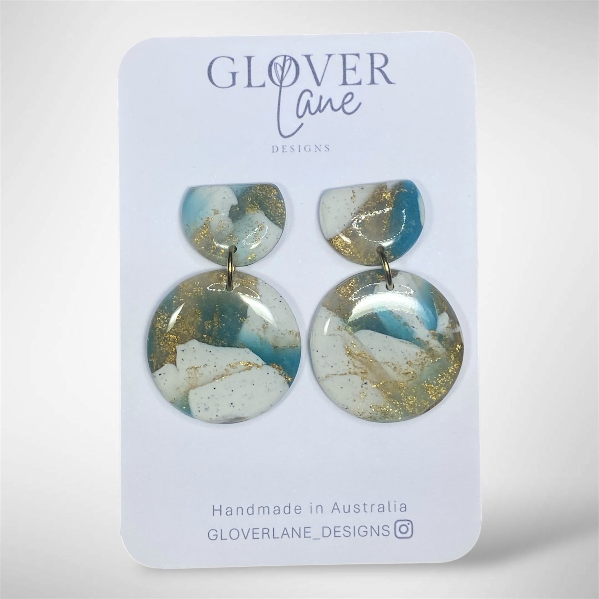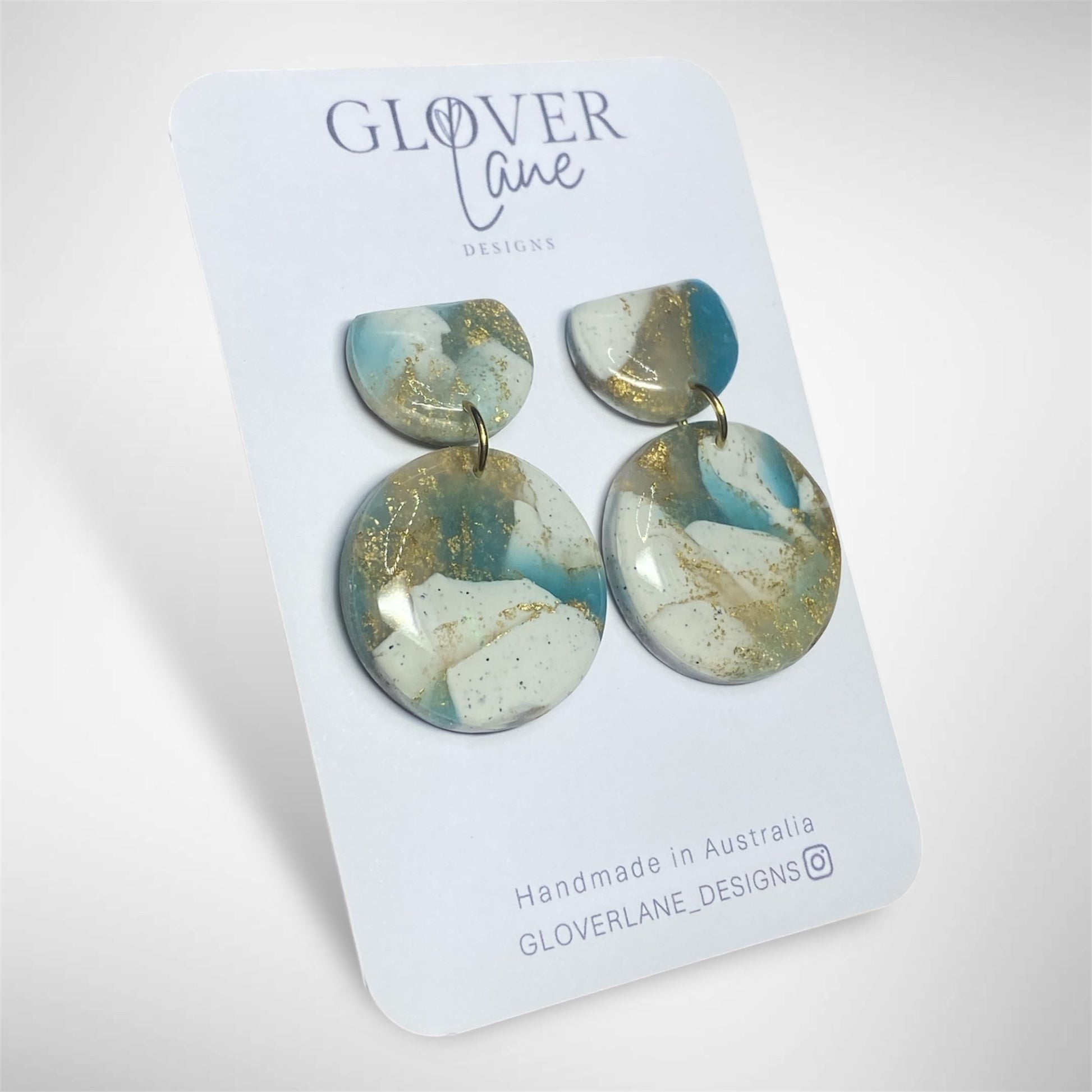 Inspired by the meeting of ocean waves and golden shores, the Seabreeze Sands Earrings capture the beauty of nature in every detail. Handcrafted from polymer clay and resin, these earrings feature a mesmerising blend of deep blue, soft white, and shimmering gold, reminiscent of sunlit tides washing over sandy beaches.